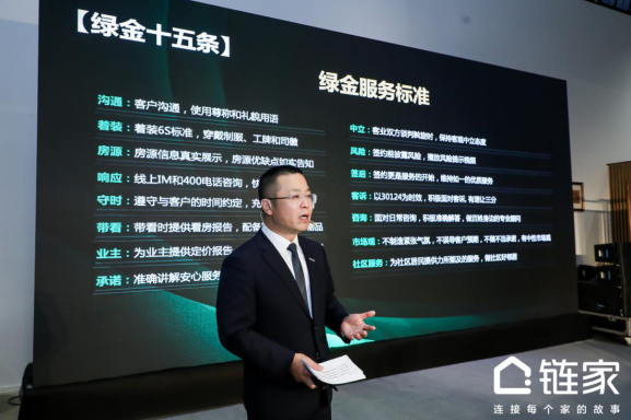 11月26日,鏈家對外發(fā)布了規(guī)范房產經紀服務的《綠金服務標準》,標準共15條,涵蓋了帶看、房源信息、業(yè)主服務、服務承諾等多個服務觸點,為房產經紀行業(yè)的品質服務進行了全新定義,也為經紀人開展客戶服務提供了方向性指引。