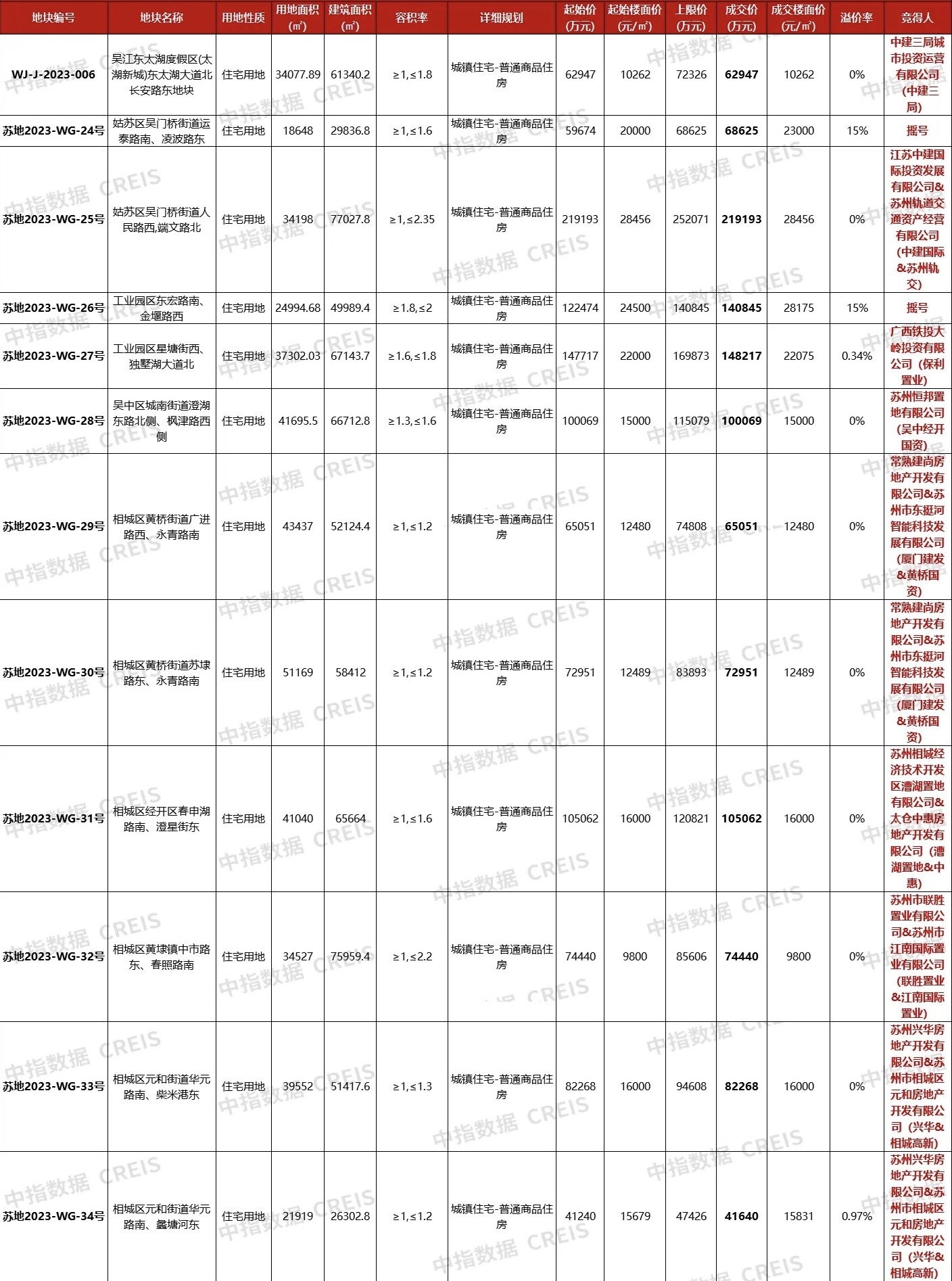 此外,相城區(qū)蘇地2023-WG-34號元和地塊由興華、相城高新聯(lián)合體以4.164億摘得,樓面價(jià)15679元/平方米,溢價(jià)率0.97%,占地面積2.2萬平方米,容積率1-1.2。