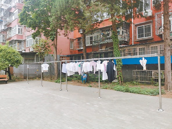 走出古城南路社區(qū)東門,沿古城東街北行400余米右轉(zhuǎn)進(jìn)入八角北路社區(qū),只見(jiàn)幾株高大的國(guó)槐及道邊的綠藤錯(cuò)落有致。再向里走,是一塊寬闊的活動(dòng)場(chǎng)地,北側(cè)建有一排不銹鋼晾衣架,架上晾滿了衣服。“有居民提出家里陽(yáng)臺(tái)上晾衣服不方便,我們特地尋找合適地方,為這些社區(qū)建了晾衣架?!北本┦课飿I(yè)有限公司(以下簡(jiǎn)稱石房物業(yè))副經(jīng)理孫偉說(shuō)。