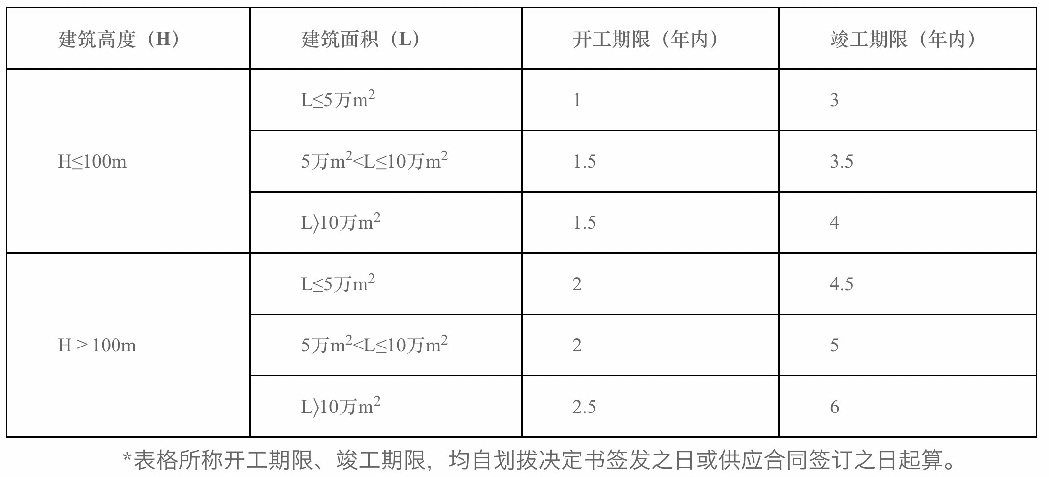 《辦法》根據(jù)項(xiàng)目用地性質(zhì)、建筑高度和建筑規(guī)模的不同,對(duì)建設(shè)用地的開工、竣工期限作出規(guī)定。(一)主體功能為住房類建設(shè)項(xiàng)目應(yīng)在劃撥決定書簽發(fā)之日或供應(yīng)合同簽訂之日起1年內(nèi)開工建設(shè),自劃撥決定書簽發(fā)之日或供應(yīng)合同簽訂之日起4年內(nèi)竣工。(二)主體功能為非住房類建設(shè)項(xiàng)目的開工、竣工期限按下表規(guī)則確定。其中,建設(shè)項(xiàng)目地下室≥3層的,其開工日期可再延長6個(gè)月,竣工期限相應(yīng)順延。