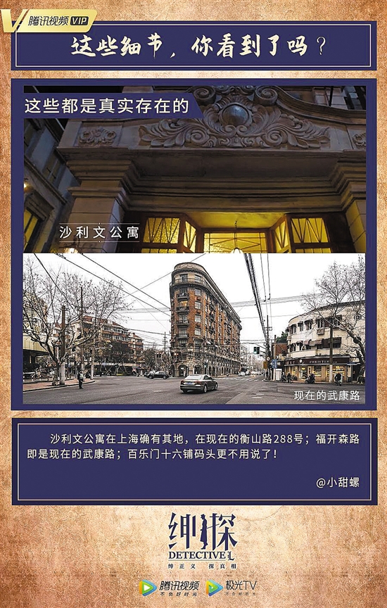 《紳探》的故事背景設(shè)在民國時期的上海,沙利文公寓、百樂門、十六鋪碼頭、公董局、采芝齋等場景呈現(xiàn)出老上海的風(fēng)貌。劇中提到的《新女性》是民國時期的著名電影,主演是阮玲玉;而第一案中死者家中擺放的《啼笑因緣》由張恨水所著,是民國時期流行一時的小說??梢娭鲃?chuàng)們在場景方面花了不少心思。此外,演員的服飾也很有“民國范兒”,羅非每次出場都是西裝、領(lǐng)帶搭配大衣和褲腳翻邊的寬松長褲,再加上呢料禮帽、手杖……盡顯當(dāng)時的上海作為時尚之都的風(fēng)范。