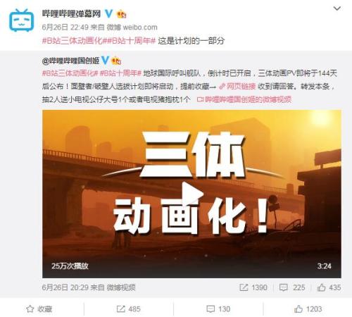 B站宣布《三體》動(dòng)畫(huà)化。微博截圖