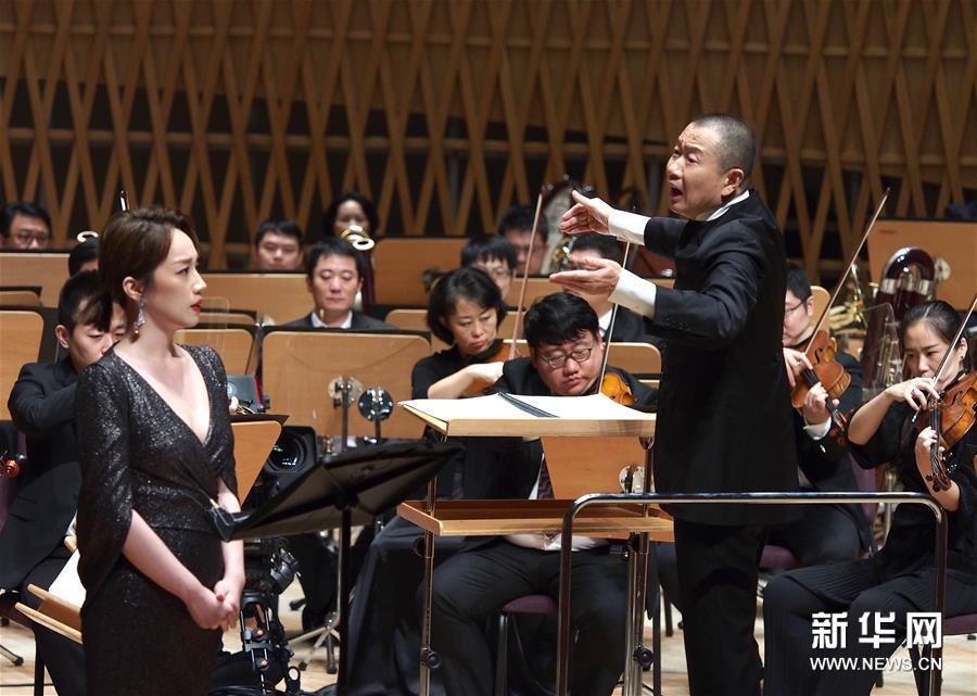 7月29日晚,作曲家譚盾(前右)在2020上海夏季音樂節(jié)閉幕音樂會上指揮。 當(dāng)日,2020上海夏季音樂節(jié)在上海交響樂團音樂廳閉幕。閉幕音樂會上演出了作曲家譚盾創(chuàng)作并指揮的《敦煌·慈悲頌》。 新華社記者 任瓏 攝