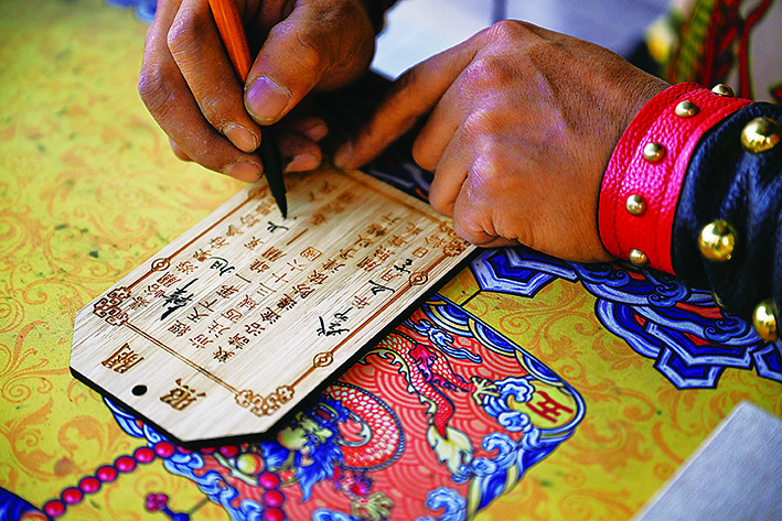 ▲李森在為游客手寫“關(guān)照”(7月14日攝)。本報(bào)記者陳鐘昊攝