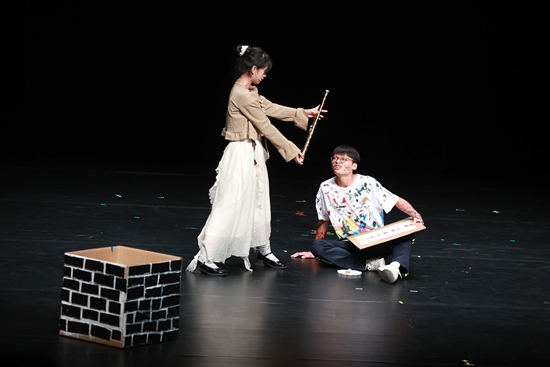 在本屆大賽的主競(jìng)演單元,學(xué)生們需要圍繞首日公布的元素詞,隨機(jī)組隊(duì),開展為期10天的限時(shí)創(chuàng)作,創(chuàng)作出20分鐘的原創(chuàng)劇目。盧昊欣第一次登上這么大的劇場(chǎng),5人小組帶來(lái)一部名叫《左右》的戲。