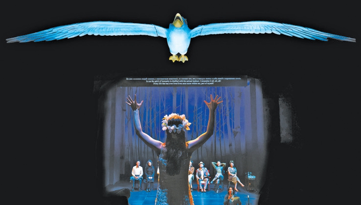 為了實現(xiàn)這一理念,劇組對舞臺進行了大刀闊斧的改造,拆除了部分觀眾席座位,使得舞臺與觀眾席之間形成了一條真實的“路”。一只巨大的海鷗懸掛在觀眾席上方,成為連接現(xiàn)實與戲劇世界的紐帶。這種獨特的舞臺設(shè)計,讓每一位走進劇場的觀眾可以看到一個與傳統(tǒng)鏡框舞臺截然不同的開放式空間,它打破了舞臺與觀眾席之間的界限,不僅營造出一種開放而沉浸的觀演環(huán)境,讓演員的表演更加自然流暢,也讓觀眾能夠更加近距離地感受到劇中人物的情感波動和命運變遷。