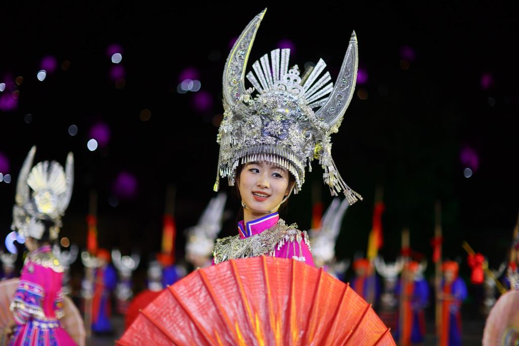 國慶將至,大型實(shí)景苗族歌舞詩劇《仰歐?!吩谫F州省黔東南苗族侗族自治州雷山縣大塘鎮(zhèn)仰歐桑劇場精彩上演。歌舞劇通過全息投影、燈光、舞美、大型裝置等實(shí)景布景,將苗族節(jié)日、習(xí)俗、服飾等民族元素搬上舞臺(tái),為觀眾呈上一臺(tái)文化盛宴。