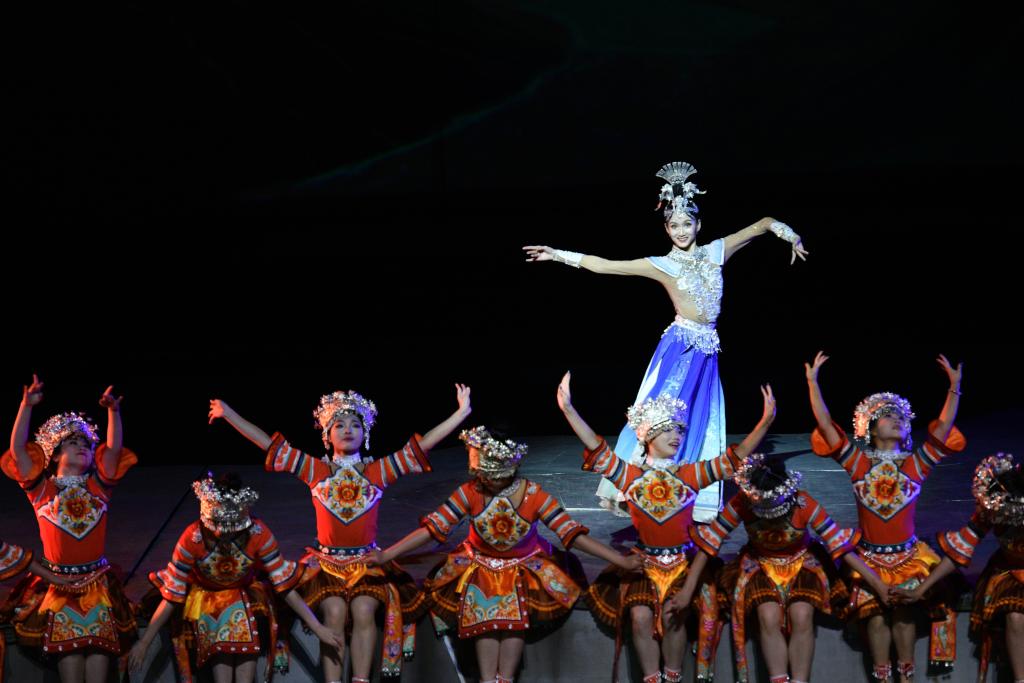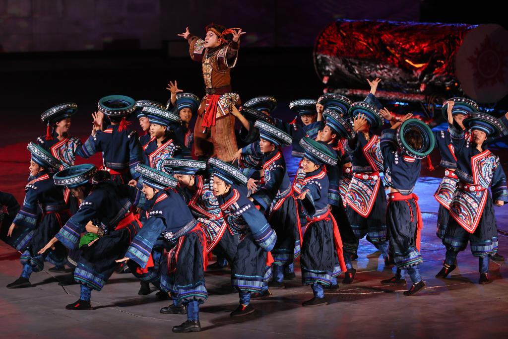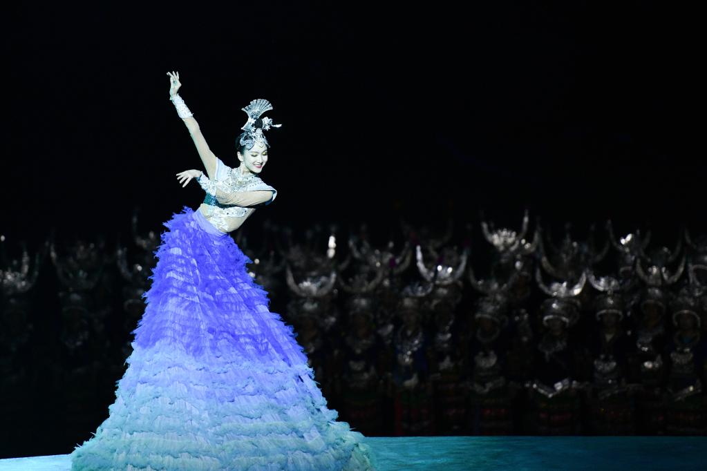 9月20日晚,演員在貴州省雷山縣大塘鎮(zhèn)表演苗族歌舞詩劇《仰歐?!?。新華社記者 楊文斌 攝