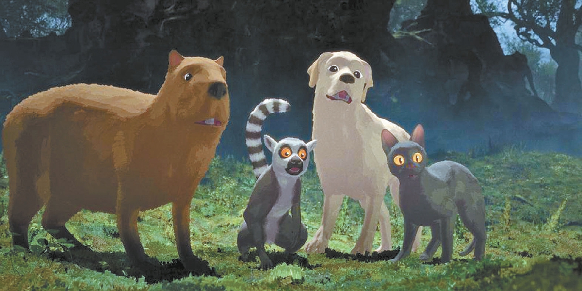電影沒(méi)有半句對(duì)白。作為主角的小黑貓和同它一道漂流的動(dòng)物們,都沒(méi)有便于人類(lèi)認(rèn)知的名字,也幾乎沒(méi)有被進(jìn)行擬人化的設(shè)計(jì)。說(shuō)“幾乎”是因?yàn)榇_有例外,卡皮巴拉因?yàn)榻新曁^(guò)尖銳刺耳,“不幸”地被聲音設(shè)計(jì)師以幼年鴕鳥(niǎo)的聲音取代。好吧,這也不是“擬人”,而是“擬鴕鳥(niǎo)”吧。