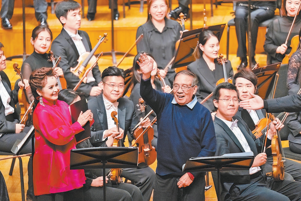 吳碧霞、黃訓(xùn)國的演唱同樣精彩,特別是在《小河淌水》《看秧歌》等選段中,吳碧霞的美妙高音與混聲合唱的互動鮮明流暢,總博得熱烈喝彩。最后一曲《孳孳》唱響,余韻中,鮑元愷登臺向觀眾致意,筆耕不輟、用幾十載時(shí)光豐盈“炎黃風(fēng)情”的作曲家,收獲全場經(jīng)久不息的掌聲。
