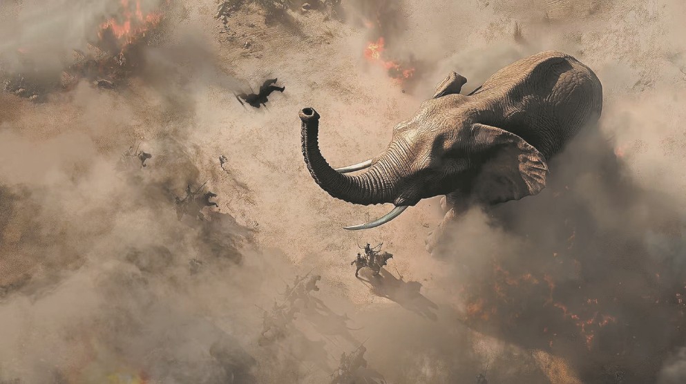 百米青銅巨門徐徐開啟,祭祀臺(tái)上女子隨樂獨(dú)舞,突然黃沙漫天,戰(zhàn)象狂奔而來,未等塵埃落定,視線閃回“博物館”,金戈鐵馬化作一尊尊精美文物浮現(xiàn)眼前……