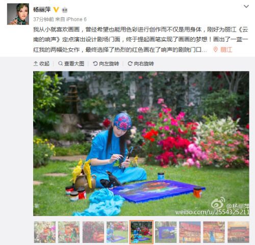 13日,舞蹈家楊麗萍在微博曬出一組自己在花園中作畫(huà)的照片。只見(jiàn)楊麗萍民族風(fēng)裝扮,而她所在的周?chē)r花滿布,姹紫嫣紅,還不時(shí)地有幾只鳥(niǎo)落在身旁,好似人間仙境。