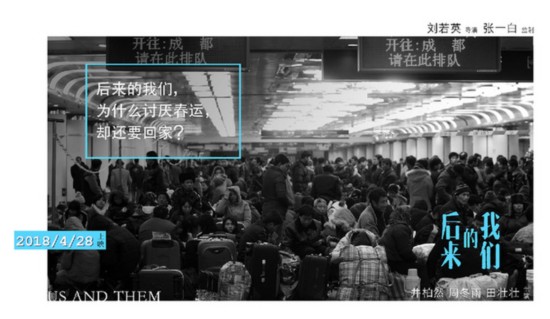 在監(jiān)制張一白的助力下,電影不但真實(shí)的還原春運(yùn)的場景,火車更成為男女主人公的初遇邂逅之地。預(yù)告片以周冬雨扮演的小曉在冰天雪地的回家的路上,一聲〝最恨春節(jié)〞的臺(tái)詞起始,最后落在男主角井柏然飾演的見清撿起她的車票收尾。期間,在黑白的電影畫面里,漂泊的人們步履匆匆,扛著大包小包匆忙的走向站臺(tái),火車上人頭攢動(dòng),直到周冬雨與井柏然的邂逅讓畫面充滿了色彩。勾起了觀眾對(duì)兩位主人公接下來的人生命運(yùn)和情感經(jīng)歷將如何發(fā)展的好奇心。