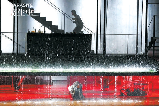 在這方如同社會(huì)切面的舞臺(tái)上,密集的戲劇沖突快速展開(kāi)。前半部分情緒高漲,金家人的把戲不斷得逞,做起了漫無(wú)邊際的美夢(mèng)。而隨著一場(chǎng)意外的大暴雨,故事急轉(zhuǎn)直下,三家人的矛盾即刻爆發(fā),奔向了格外慘烈的結(jié)局。在兩個(gè)多小時(shí)的表演中,演員們相當(dāng)賣(mài)力,飾演金家姐弟的郝蕾與馬天宇都交上了合格的答卷。在對(duì)姐姐金基婷一角的駕馭上,話(huà)劇表演經(jīng)驗(yàn)豐富的郝蕾顯然游刃有余,甚至?xí)層^眾感嘆她的演技有些大材小用。首次出演話(huà)劇的馬天宇也值得肯定。飾演金家父母的房子斌和趙紅薇堪稱(chēng)全劇的靈魂,大段的臺(tái)詞、極致的情感落差對(duì)他們的體力和表演功底都提出了相當(dāng)高的要求。謝幕時(shí),觀眾格外熱烈的掌聲是給予演員的最好肯定。舞臺(tái)上,金父應(yīng)聘樸社長(zhǎng)司機(jī)、所有人為樸家小兒子演出慶生小戲劇等片段運(yùn)用了相當(dāng)風(fēng)格化的表演方式,在滑稽而悲涼的黑色幽默中,充分展現(xiàn)了舞臺(tái)藝術(shù)區(qū)別于電影的獨(dú)特虛擬性和表現(xiàn)力。