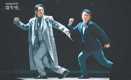 以倒敘開頭的舞臺(tái)劇《寄生蟲》延綿著一種玄幻神秘的未來感,有人看到了命運(yùn)翻盤,有人看到了無間道的凄苦輪回:大難不死的基澤為了拯救墮入深淵的父親,把他父親打破的枷鎖重新綁在了自己的身上,努力成為曾經(jīng)痛恨的人。為了迎接斬殺黑暗的那道曙光,寧愿再度沉入一個(gè)漫長的苦役。