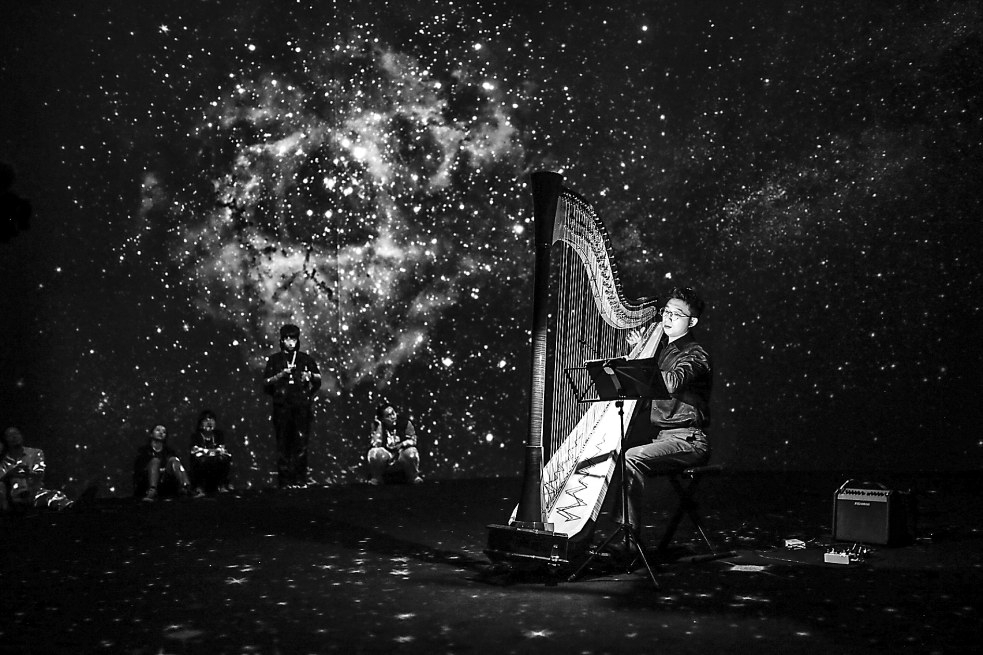 開幕當(dāng)天還舉辦了以“奔赴天文與藝術(shù)的宇宙浪漫”為題的論壇,圍繞展覽中的天文藝術(shù)作品展開討論。時代美術(shù)館執(zhí)行副館長劉威威表示,展覽通過藝術(shù)化手段、人文關(guān)懷的角度呈現(xiàn)硬核科學(xué)知識,讓公眾更好地認(rèn)知科學(xué),感受宇宙的浪漫。她相信,這樣“詩意的科普”與“科普的詩意”結(jié)合也許是未來科學(xué)藝術(shù)展的趨勢之一。論壇結(jié)束后,青年豎琴演奏家馬佳杰在星輝斑斕的展廳內(nèi)帶來了精彩的現(xiàn)場音樂會。展覽將持續(xù)至10月8日。