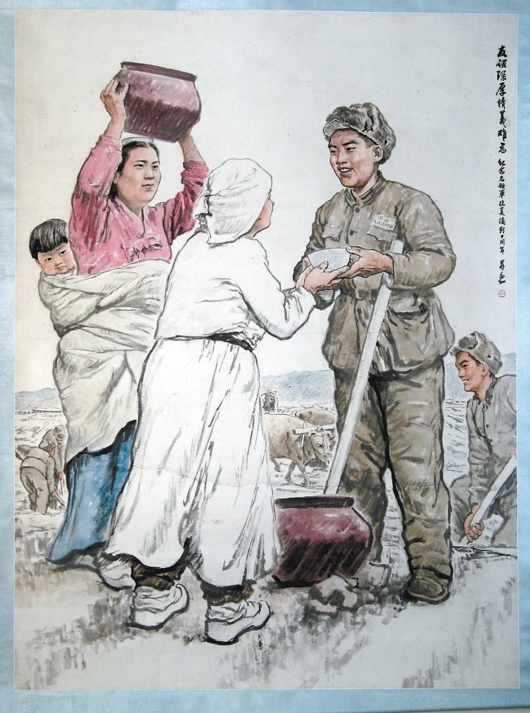 ??在展廳里,有一幅蔣兆和創(chuàng)作的中國(guó)畫《友誼深厚情義難忘》,畫中的“紀(jì)念志愿軍抗美援朝十周年”題跋道出了其創(chuàng)作的時(shí)間。畫面的主體是兩位朝鮮婦女正為志愿軍戰(zhàn)士送水,其中一位婦女還背著可愛(ài)的幼兒。在幾位主要人物的身后,畫家細(xì)致地描繪了志愿軍戰(zhàn)士們?cè)谵r(nóng)田幫助朝鮮人民恢復(fù)農(nóng)業(yè)生產(chǎn)的場(chǎng)景。在中朝軍隊(duì)打退以美國(guó)為首的“聯(lián)合國(guó)軍”、朝鮮停戰(zhàn)協(xié)定簽訂后,志愿軍在鞏固防守的同時(shí),還幫助朝鮮人民建設(shè)新家園,與朝鮮人民結(jié)下了深厚情誼。