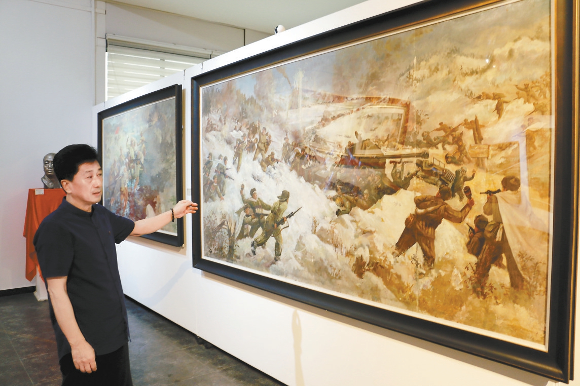 ??“1951年,畫家伍必端以戰(zhàn)地記者身份到朝鮮前線采訪,創(chuàng)作多幅戰(zhàn)地速寫,這幅作品是他創(chuàng)作的油畫《中朝部隊(duì)并肩作戰(zhàn)打擊美國(guó)狼》?!背r萬(wàn)壽臺(tái)創(chuàng)作社美術(shù)館館長(zhǎng)吉正太介紹,這幅畫表現(xiàn)的是上甘嶺戰(zhàn)役中激烈的戰(zhàn)斗場(chǎng)景,冬日的戰(zhàn)場(chǎng)上覆蓋著白雪,空中硝煙彌漫,中國(guó)人民志愿軍和朝鮮人民軍的戰(zhàn)士們正抗擊侵略者,有的在扔手榴彈,有的在沖鋒,還有的與侵略者近身搏斗……身處前線的伍必端用畫筆記錄下最可愛(ài)的人,展現(xiàn)出一位人民藝術(shù)家對(duì)革命事業(yè)的一腔赤誠(chéng)。