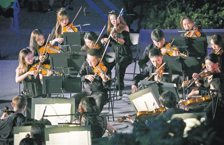 8月22日,昆明池畔,隨著歌曲《一生所愛》的旋律響起,由西安交響樂團(tuán)、西安交響樂團(tuán)合唱團(tuán)帶來的“因?yàn)閻勰恪呦χ黝}交響樂之夜”活動(dòng)拉開帷幕。七夕湖上波光粼粼,鵲橋凌波含情脈脈。在修建之初就被融入愛情主題的昆明池·七夕公園,在極具浪漫色彩的古韻與美景中,通過交響樂與經(jīng)典電影畫面的視聽結(jié)合形式,線上線下同步向觀眾展現(xiàn)亙古不變的美好愛情和永恒浪漫。