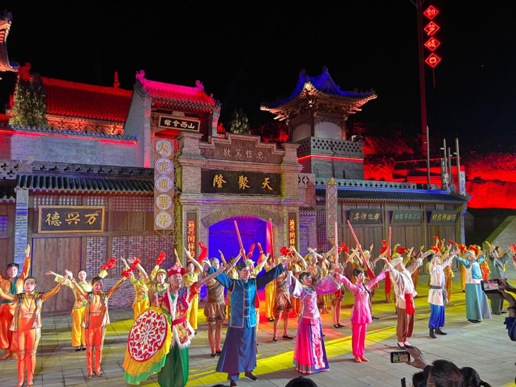 這是一場別樣的演出,山水和風情在劇場里交相輝映。在“九曲黃河第一鎮(zhèn)”的磧口岸邊,在黃土高原呂梁山脈的懷抱里,觀眾坐在360度的露天旋轉(zhuǎn)觀演臺上,高科技舞臺技術(shù)和燈光投影矩陣的加持下,現(xiàn)代演藝手段和傳統(tǒng)文化相互融合。演員表演生動投入,將黃河文化、晉商文化、民俗文化、紅色文化潤于觀眾心中。
