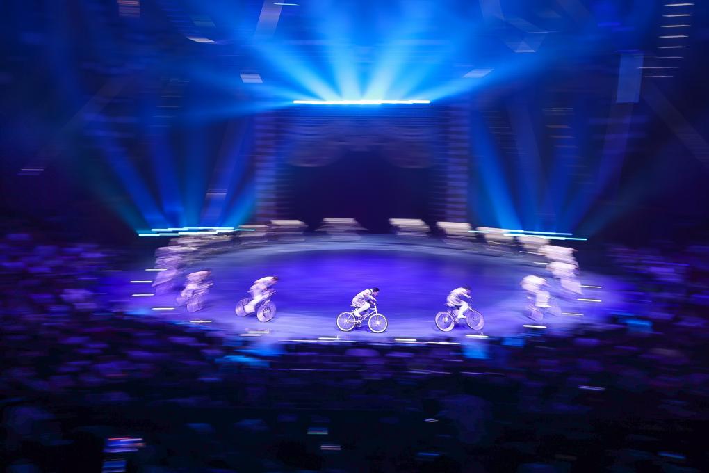 中國雜技團(tuán)演員表演創(chuàng)新節(jié)目“逐風(fēng)者·男子集體車技”,綜合運用翻騰、頂功、拋接等技藝(11月5日攝)。新華社記者 劉大偉 攝
