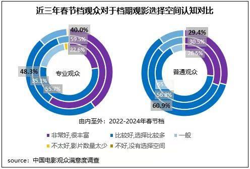 2024年春節(jié)檔優(yōu)質(zhì)的影片內(nèi)容矩陣有效拉動觀影及討論氛圍,檔期內(nèi)有合計90.3%的普通觀眾認(rèn)為檔期觀影選擇空間“非常好”或“比較好”,這一占比較去年同期高出2.9個百分點;專業(yè)觀眾這一占比為88.3%,略低于去年同期。