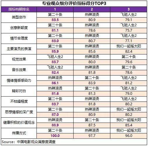 在專業(yè)觀眾評價體系中,《第二十條》的類型創(chuàng)作、創(chuàng)意新穎度、情節(jié)合理度、主要演員的表演、不枯燥、思想情感的深廣度和傳播方式7項指標(biāo)得分均居檔期首位,《熱辣滾燙》的情緒情感感染力、精彩對白和健康積極的價值觀念為第一名,《飛馳人生2》的視覺效果、音樂效果獲得檔期最高評分。另外,《我們一起搖太陽》的主要演員的表演、思想情感的深廣度、健康積極的價值觀念和傳播方式得分也進(jìn)入檔期前三位。