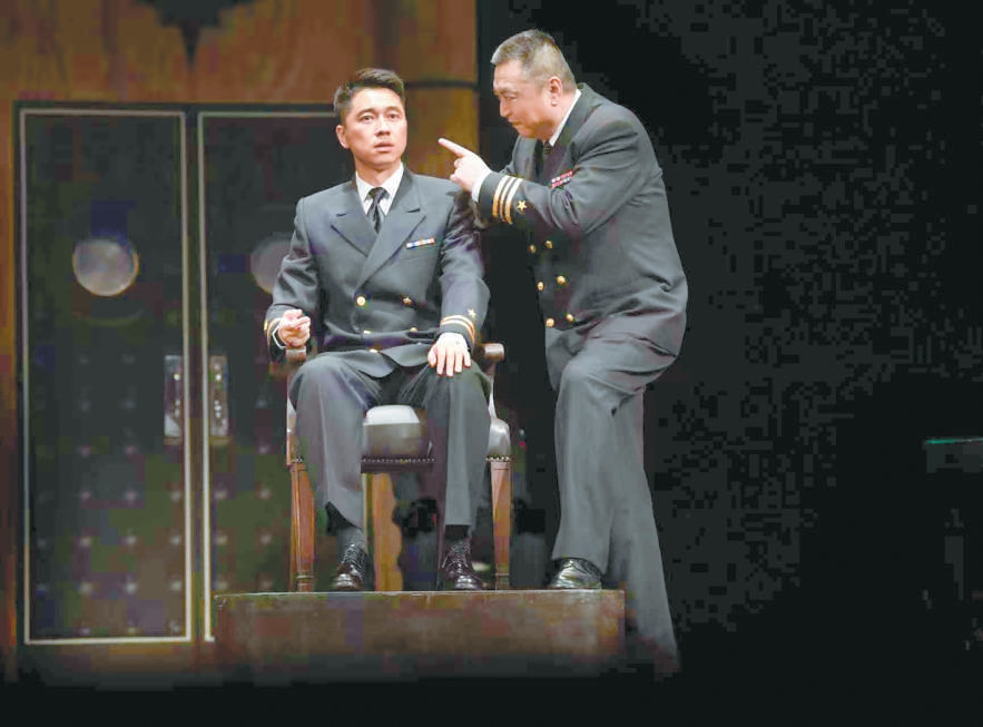 于觀眾而言,戲骨飆戲是《嘩變》格外精彩的看點,無論是制造了“草莓事件”“黃色燃料事件”“電咖啡壺事件”等一系列“鬧劇”的艦長魁格、以“詭計”掌控全場節(jié)奏的律師格林渥,還是圖窮匕見、老謀深算的基弗,抑或每一個各懷目的、性格鮮明的角色,他們之間起伏有致的銜接是對演員表演功底的極大考驗。飾演魁格的馮遠(yuǎn)征把《嘩變》總結(jié)為一場“坐著把戲演好”的挑戰(zhàn),全劇除了格林渥與檢察官可以走動,其他所有人幾乎坐著演完全程,如何把臺詞說得詳細(xì)、說得抓人,同時靠說就把角色塑造到位,是演員需要日日精進(jìn)的功課,也是觀眾愿意一再為之奔赴而來的重要理由。