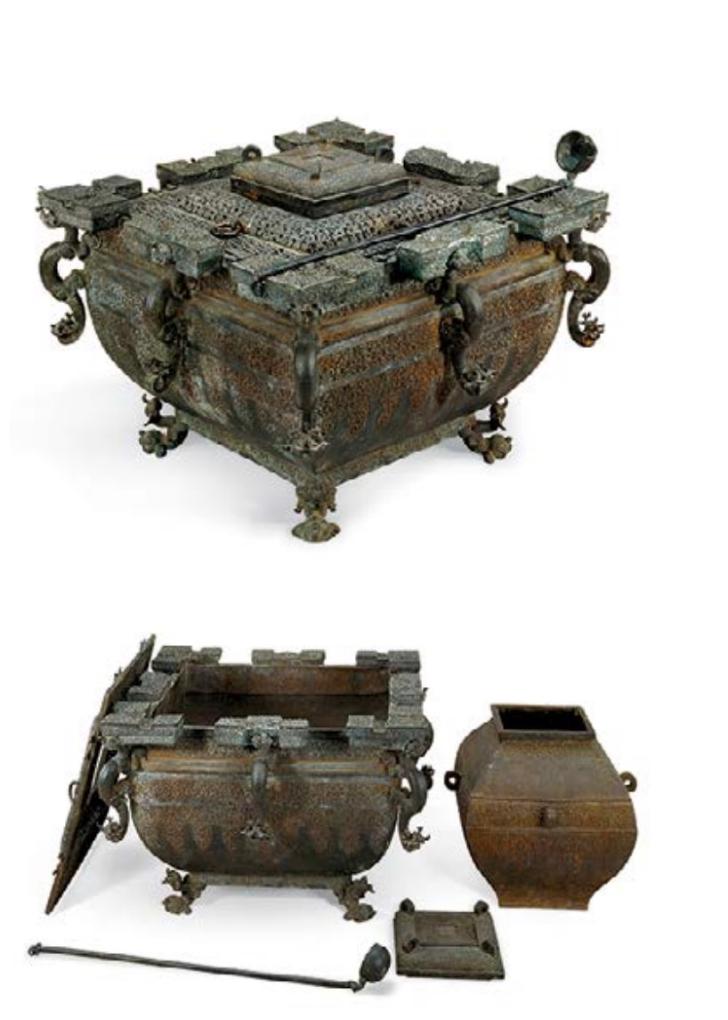 影片中用于冰酒的銅鑒缶正是出自于湖北省博物館館藏曾侯乙銅鑒缶,它由外部的鑒、鑒內置的缶組成,是中國最早的“冰箱”。在鑒的內部放上缶,中間的空隙放上冰塊,可在祭祀和宴饗時冰鎮(zhèn)酒。“以古為鑒”“擊缶而歌”等成語亦由此衍生而來。