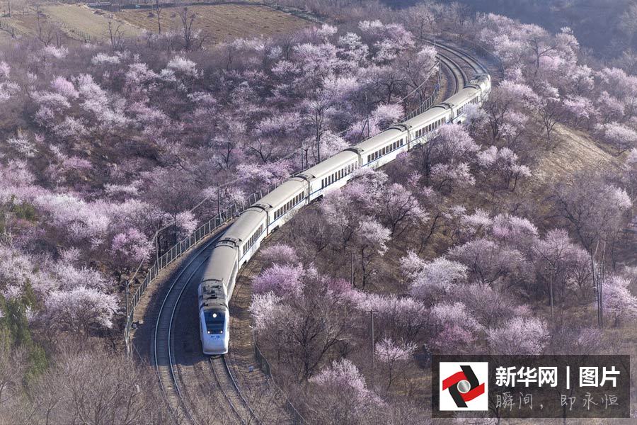 2016年3月23日,中國北京,又到一年花開時,數(shù)京城最美的鐵路景色還看京張鐵路居庸關(guān)。漫山遍野的桃花盛開,S2雪白的列車穿行其中,美不勝收。圖片來源:東方IC