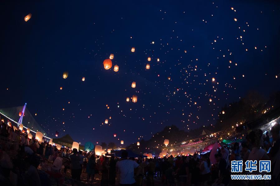 當(dāng)日,各族群眾和國(guó)內(nèi)外游客在云南西雙版納景洪市瀾滄江畔放飛孔明燈,喜迎傣歷1378年新年。