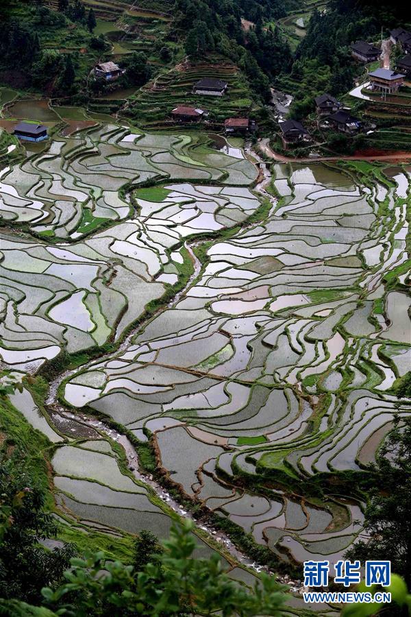 5月20日在廣西柳州市融水苗族自治縣桿洞鄉(xiāng)拍攝的梯田。廣西柳州市融水苗族自治縣桿洞鄉(xiāng)平均海拔780多米,是全縣高海拔鄉(xiāng)鎮(zhèn)之一。這里的梯田多在高山,人們稱之為“天上糧倉”。時下,“天上糧倉”或儲水待插,或新秧初栽,如織錦一般美不勝收。新華社發(fā)(龍濤 攝)