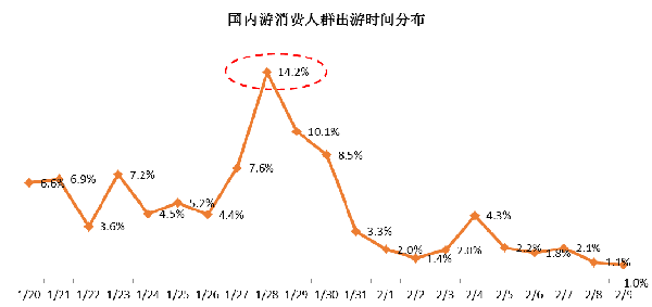 出游時(shí)間方面,春節(jié)國內(nèi)長線游者選擇節(jié)前錯峰游的占比38.3%,春節(jié)黃金周期間出游的占比47.2%,1月28日(正月初一)達(dá)到客流峰值,選擇節(jié)后錯峰出游的僅占比14.5%。