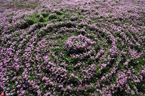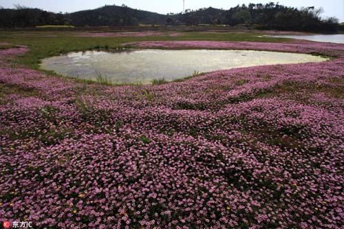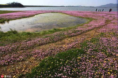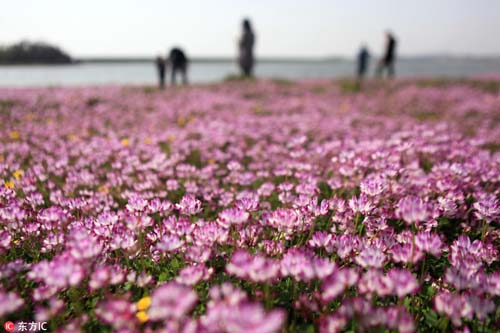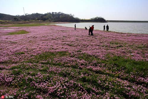 2017年3月26日,在我國最大淡水湖鄱陽湖畔,紫云英等盡情綻放。藍(lán)天白云,青山碧水,紅花綠草構(gòu)成的醉美春色,吸引不少游客觀賞拍攝。