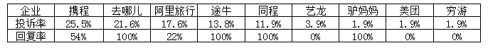 數(shù)據(jù)顯示,各省份旅游投訴中,涉及江蘇的投訴最多,占全國各省份旅游投訴量的19.2%,上海、河北、遼寧、浙江和四川并列第二,各占7.7%。在線旅游企業(yè)投訴中,涉及攜程旅行網的投訴最多,占在線旅游企業(yè)投訴總量的25.5%,去哪兒網(21.6%)排第二,阿里旅行·去?。?7.6%)排第三。其他被投訴的企業(yè)還有途牛旅游網、同程旅游、藝龍旅行網、驢媽媽旅游網、美團網和窮游網。本月同程旅游、去哪兒網、途牛旅游網和驢媽媽旅游網回復率均為100%,驢媽媽旅游網回復耗時最短,平均回復時長為17個小時。