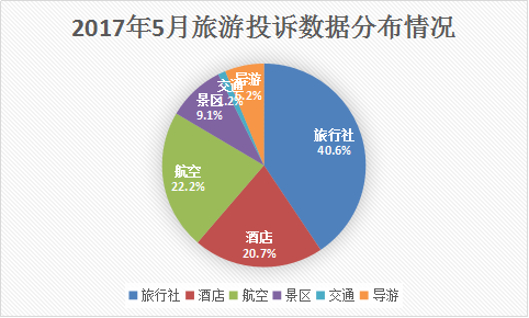 據(jù)平臺統(tǒng)計,5月涉及旅行社投訴最多,占比為40.6%,其次為航空投訴(22.2%)、酒店投訴(20.7%)、景區(qū)投訴(9.1%),導游投訴(6.2%)和交通投訴各占(1.2%)。涉及旅行社的投訴主要提及了導游強制購物、商家無故取消訂單、不退款等問題。