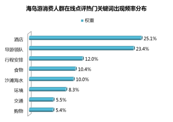 《報告》基于同程旅游海島游用戶在線點評數據的分析顯示,“住”是海島游消費人群最為關注的一個消費元素,其次是人員服務(尤其是導游領隊),與游客全程接觸的導游領隊的服務態(tài)度、專業(yè)度等也非常受關注,甚至成為影響游客最終評價的關鍵因素。相比之下,購物的關注度相對較低,這與普通的旅游線路存在較大差別。此外,沙灘、海水等與海島相關的風景元素受關注程度較高,不少游客在點評中用較大篇幅描述沙灘、海水等風景元素。