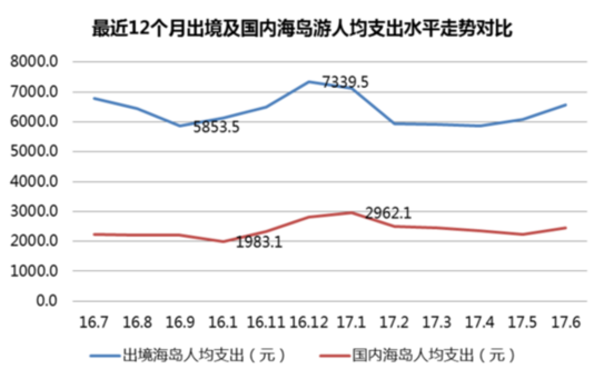 《報告》提供的同程旅游海島游消費數據顯示,最近一年(2016年7月至2017年6月)出境海島游消費人群用于購買旅游產品(線路、交通、住宿等,不含購物消費)的人均支出為6340.6元,國內海島游人均支出為2368.9元。從時間軸來看,出境海島游和國內海島游的人均支出水平明顯與出游客流的季節(jié)呈現出同步變化趨勢,出境海島游旺季人均支出最高可達7339.5元,國內海島游旺季人均支出最高可達2962.1元。