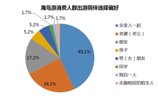 出游同伴選擇偏好分析可從消費人群社會關系的角度間接看到當前海島游的客群結構。《報告》基于同程旅游海島游用戶數據分析顯示,43.1%的人選擇全家人一起出游,24.1%的人選擇與伴侶一起出游。結合人群年齡分布數據來看,家庭、新婚夫婦、情侶、親子是海島游的核心客群。