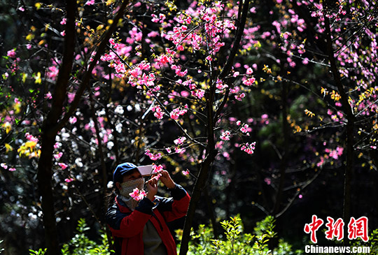 郊野公園里一位在用手機(jī)拍攝盛開(kāi)桃花的市民。 中新社記者 李進(jìn)紅 攝