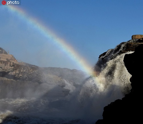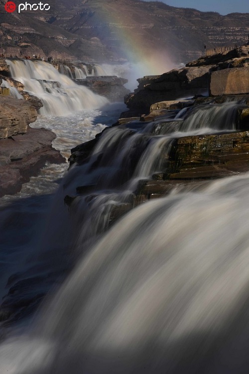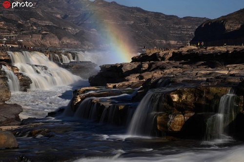 2019年11月25日,山西吉縣黃河壺口瀑布出現(xiàn)“彩虹通天”美景。入冬以來(lái),隨著黃河干流水位回落,壺口瀑布落差加大,滾滾河水翻滾而下,飛濺起30多米高的水霧,在陽(yáng)光的照射下,形成“彩虹通天”的美麗景象,讓游客流連忘返。呂桂明/攝