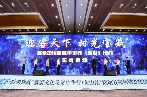 大會(huì)最后,八位嘉賓共同上臺(tái)按下啟動(dòng)按鈕,宣布“迎客天下 時(shí)光寶藏——旅游文化鑒賞中華行(黃山)活動(dòng)”正式啟動(dòng)。