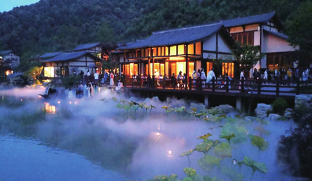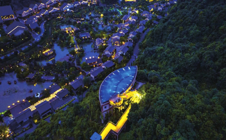 徜徉泳池,可觀(guān)落日余暉、滿(mǎn)天星辰,一邊是古風(fēng)古韻的漢唐建筑,一邊是綠意正濃的山林竹間;一半是封存塵世的自然風(fēng)景,一半是觸手可及的浪漫風(fēng)情。俯瞰葛仙村,盡享古韻之美。傍晚,落日余暉均勻曬在水面上,散為金光,而晚霞,也幻成異樣的色彩,一層層的光和色,相互交融著,“落霞與孤鶩齊飛,秋水共長(zhǎng)天一色”的意境就是如此吧。夜里輕柔的晚風(fēng),拂過(guò)泳池,水波粼粼,被周邊的燈光映襯得就像無(wú)數(shù)的水晶鋪設(shè)在水面上,星空與池底交相呼應(yīng),帶來(lái)無(wú)盡的浪漫氣息。