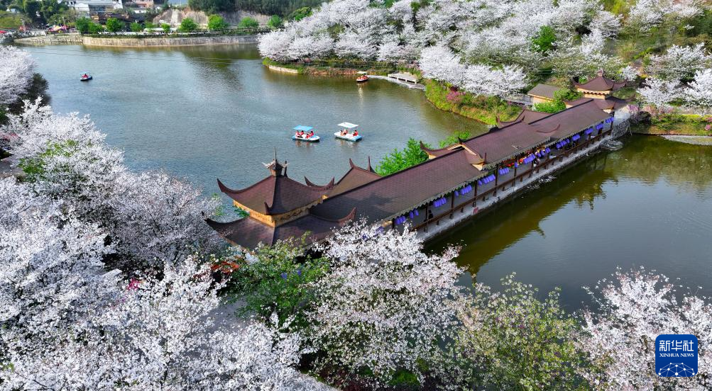 3月24日,游人在瀘州市江陽(yáng)區(qū)丹林鎮(zhèn)建設(shè)村“櫻花谷”泛舟賞櫻(無(wú)人機(jī)照片)。