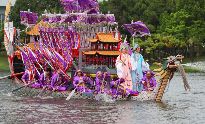 新華社上海6月10日電(記者陳愛(ài)平、許曉青)隨著立竿、出龍、點(diǎn)睛、接龍、送標(biāo)、旺盆等儀式完成,68歲的張亭源老人身著金黃色底、繡有青龍圖案的衣裳,健步登上五彩龍船。平底、昂首、翹尾的龍船在上海寶山美蘭湖面靈活行駛、快速轉(zhuǎn)彎,隊(duì)員們齊聲呼號(hào),戲曲演員立于船頭,彩旗在風(fēng)中飄揚(yáng),引得現(xiàn)場(chǎng)觀眾連連叫好。