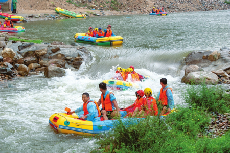 體驗(yàn)完水上樂(lè)園后,張子良一行乘車來(lái)到位于中莊村的龐泉溝激情漂流。剛下車就看到了碼頭上熱鬧的景象,一艘艘漂流艇上坐滿了前來(lái)體驗(yàn)的游客,大家穿著救生衣在工作人員的護(hù)送下向下漂流。偶爾遇到一處急流險(xiǎn)灘,漂流艇隨著奔騰的水流飛馳而起,一眨眼的工夫就已落到了下一個(gè)平潭區(qū),游客們發(fā)出了陣陣尖叫。一路刺激,一路驚心,漂流給游客們留下了深刻的印象。負(fù)責(zé)該項(xiàng)目的閔玉貴介紹,項(xiàng)目選取了文峪河最精華的10公里河道,累計(jì)落差130米,平均水深0.8米,河道時(shí)寬時(shí)窄,水流時(shí)急時(shí)緩,沿途既有急流險(xiǎn)灘,又有緩流碧潭,由于經(jīng)過(guò)了精心設(shè)計(jì),且河道兩岸安排了上百名安全員護(hù)航,可以確保有驚無(wú)險(xiǎn)。