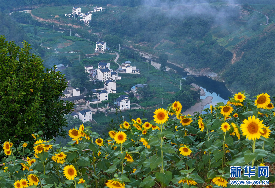 夏日,安徽省黃山市歙縣石潭古村景色迷人,向日葵、格?;ù蔚诰`放。游客們?cè)诨êV嗅溽?,感受著?shī)意盎然的夏日鄉(xiāng)村美景。
