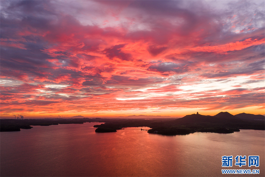 近日,安徽省池州市平天湖上空出現(xiàn)絕美朝霞景觀。新華網(wǎng)發(fā)(饒治國(guó) 攝)