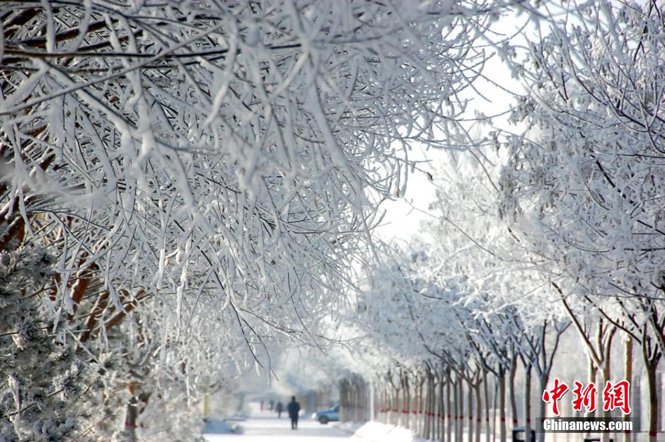 受寒潮低溫的影響,甘肅省玉門市城鄉(xiāng)近期普降中到大雪,寒流使這里大片的樹木上形成美麗的霧凇,十分壯觀,吸引眾多市民走出戶外欣賞美麗的霧凇美景。萬(wàn)宗平 攝