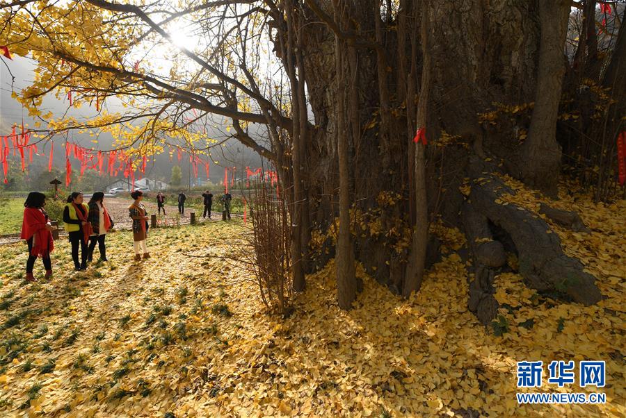11月19日,游客在留壩縣玉皇廟鎮(zhèn)參觀千年銀杏樹。初冬時節(jié),在秦嶺深處的陜西省留壩縣玉皇廟鎮(zhèn)石窯壩村,一棵千年古銀杏樹的落葉宛如金色地毯,甚為壯觀。據當?shù)亓謽I(yè)部門介紹,該樹胸徑為4.45米,現(xiàn)有高度29米。新華社記者 陶明 攝